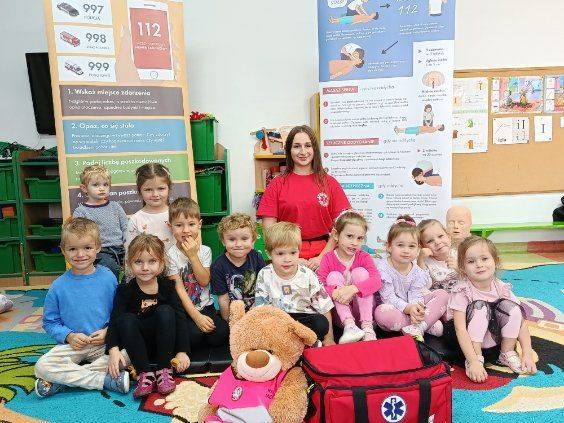 Na samym początku Pani Ratownik pokazał dzieciom jak wygląda strój, w którym pracuje na co dzień. Wyjaśniła na czym polega jego praca. Następnie przedszkolaki miały okazję wysłuchać informacji na temat udzielania pierwszej pomocy oraz samodzielnie wykonywać czynności związane z udzielaniem pierwszej pomocy z wykorzystaniem profesjonalnego fantomu. Dzieci utrwaliły sobie numery alarmowe  oraz zasady bezpiecznej zabawy. Zdobyta wiedza i ćwiczenia praktyczne sprawiły, że przedszkolaki poczuły się “małymi ratownikami”. Na zakończenie dzieci podziękowały Pani Ratownik za wizytę i zrobiły wspólnie pamiątkowe zdjęcie z tego dnia. Każde dziecko otrzymało pamiątkowy dyplom oraz naklejki.