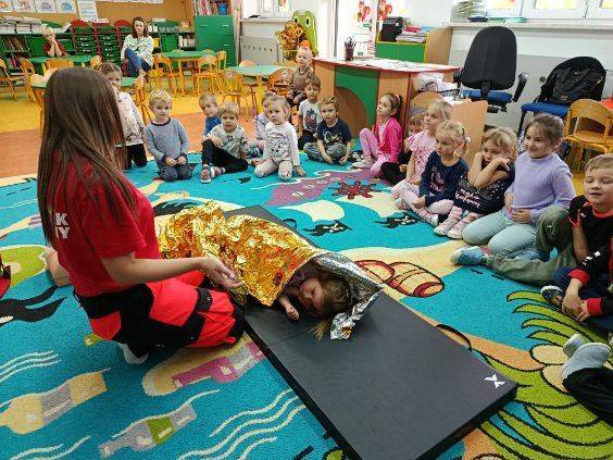 Na samym początku Pani Ratownik pokazał dzieciom jak wygląda strój, w którym pracuje na co dzień. Wyjaśniła na czym polega jego praca. Następnie przedszkolaki miały okazję wysłuchać informacji na temat udzielania pierwszej pomocy oraz samodzielnie wykonywać czynności związane z udzielaniem pierwszej pomocy z wykorzystaniem profesjonalnego fantomu. Dzieci utrwaliły sobie numery alarmowe  oraz zasady bezpiecznej zabawy. Zdobyta wiedza i ćwiczenia praktyczne sprawiły, że przedszkolaki poczuły się “małymi ratownikami”. Na zakończenie dzieci podziękowały Pani Ratownik za wizytę i zrobiły wspólnie pamiątkowe zdjęcie z tego dnia. Każde dziecko otrzymało pamiątkowy dyplom oraz naklejki.