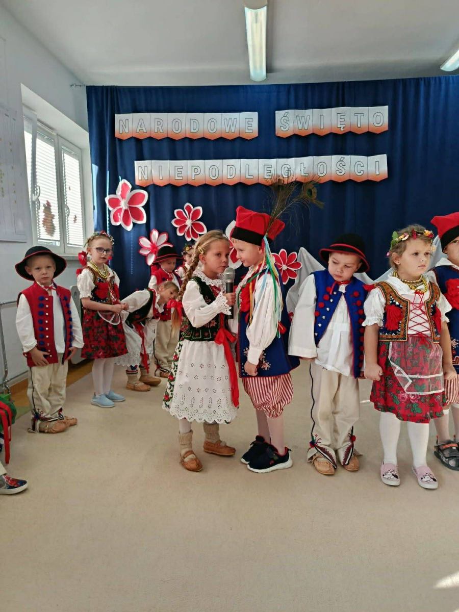 11 listopada br. to wielki i szczęśliwy dzień dla wszystkich Polaków. Właśnie tego dnia po 123 latach niewoli, Polska odzyskała niepodległość. Dlatego co roku 11 listopada obchodzimy nasze Święto Narodowe – Święto Niepodległości. W dniu 12 listopada Nauczyciele oraz dzieci w naszym przedszkolu w regionalnych strojach ludowych tańcem, słowem i piosenką oddały szacunek symbolom narodowym, symbolom walki o wolność i zwycięstwo oraz okazały miłość do Ojczyzny.  Na zakończenie całej uroczystości po słowach: „Baczność, do Hymnu” wszyscy odśpiewaliśmy Nasz Hymn Narodowy,  uwieczniając to wydarzenie pamiątkowym zdjęciem.