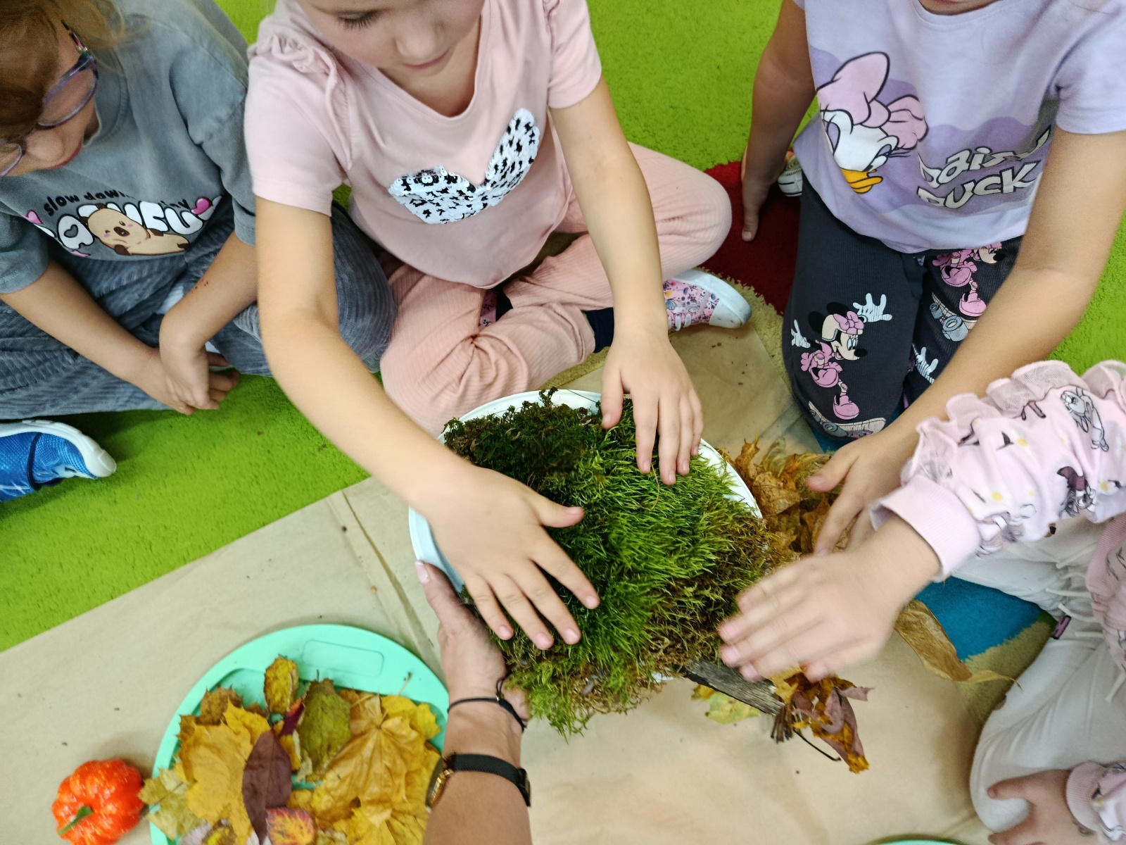 Przedszkolaki miały okazję poczuć się w przedszkolu jak w prawdziwym lesie – salę wypełnił zapach gałęzi, żywicy, kory i mchu. Dzieci badały zebrane przez nauczycielkę dary lasu za pomocą zmysłów – dotyku, poprzez poznawanie różnych faktur oraz zapachu. Dzieci poszerzyły swoją wiedzę w quizie – rozwiązywały zagadki słowne i słuchowe rozpoznając dźwięki lasu. Na koniec, maluszki przeszły przez leśną ścieżkę sensoryczną badając „las” bosymi stópkami.