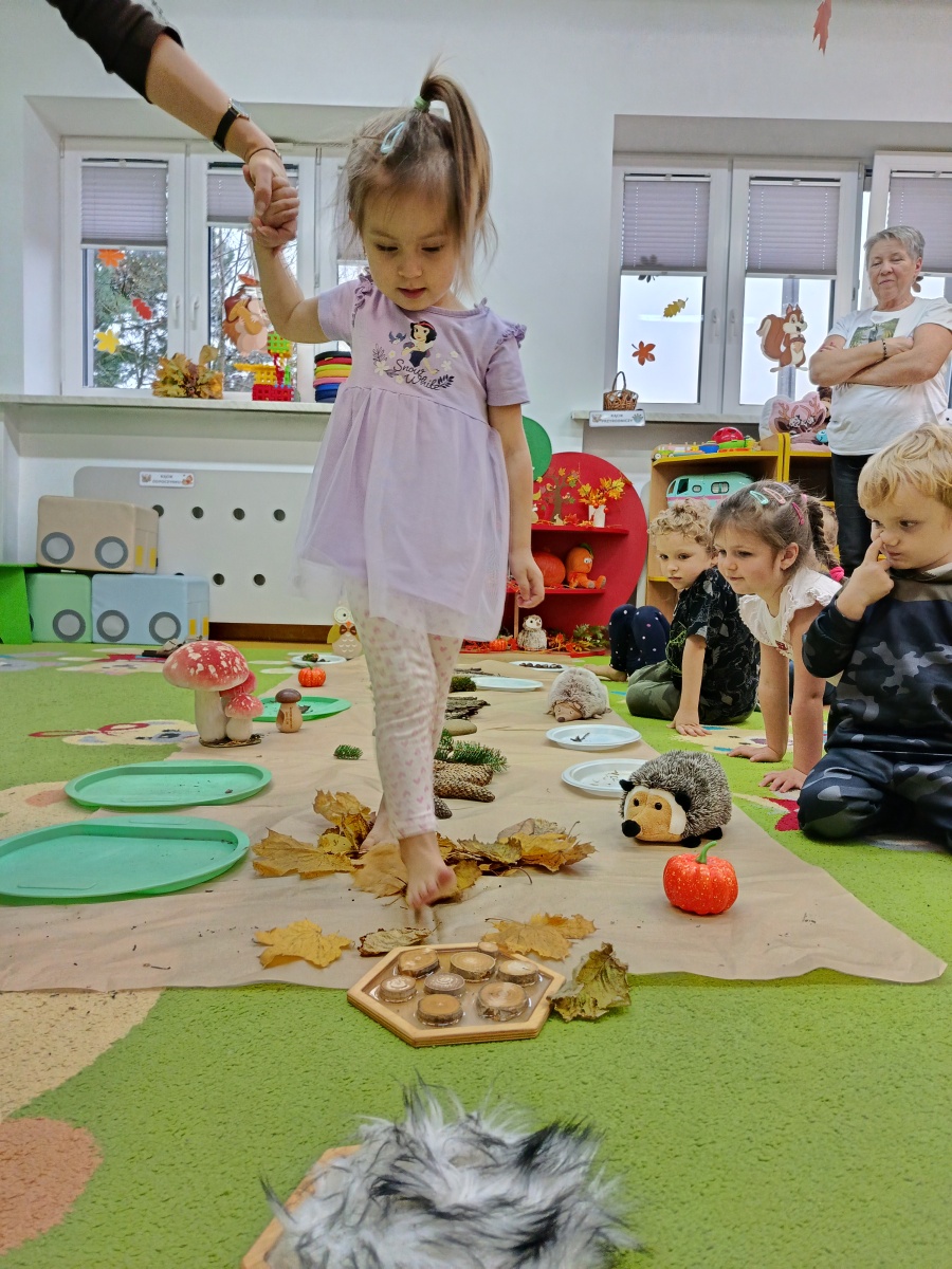 Przedszkolaki miały okazję poczuć się w przedszkolu jak w prawdziwym lesie – salę wypełnił zapach gałęzi, żywicy, kory i mchu. Dzieci badały zebrane przez nauczycielkę dary lasu za pomocą zmysłów – dotyku, poprzez poznawanie różnych faktur oraz zapachu. Dzieci poszerzyły swoją wiedzę w quizie – rozwiązywały zagadki słowne i słuchowe rozpoznając dźwięki lasu. Na koniec, maluszki przeszły przez leśną ścieżkę sensoryczną badając „las” bosymi stópkami.