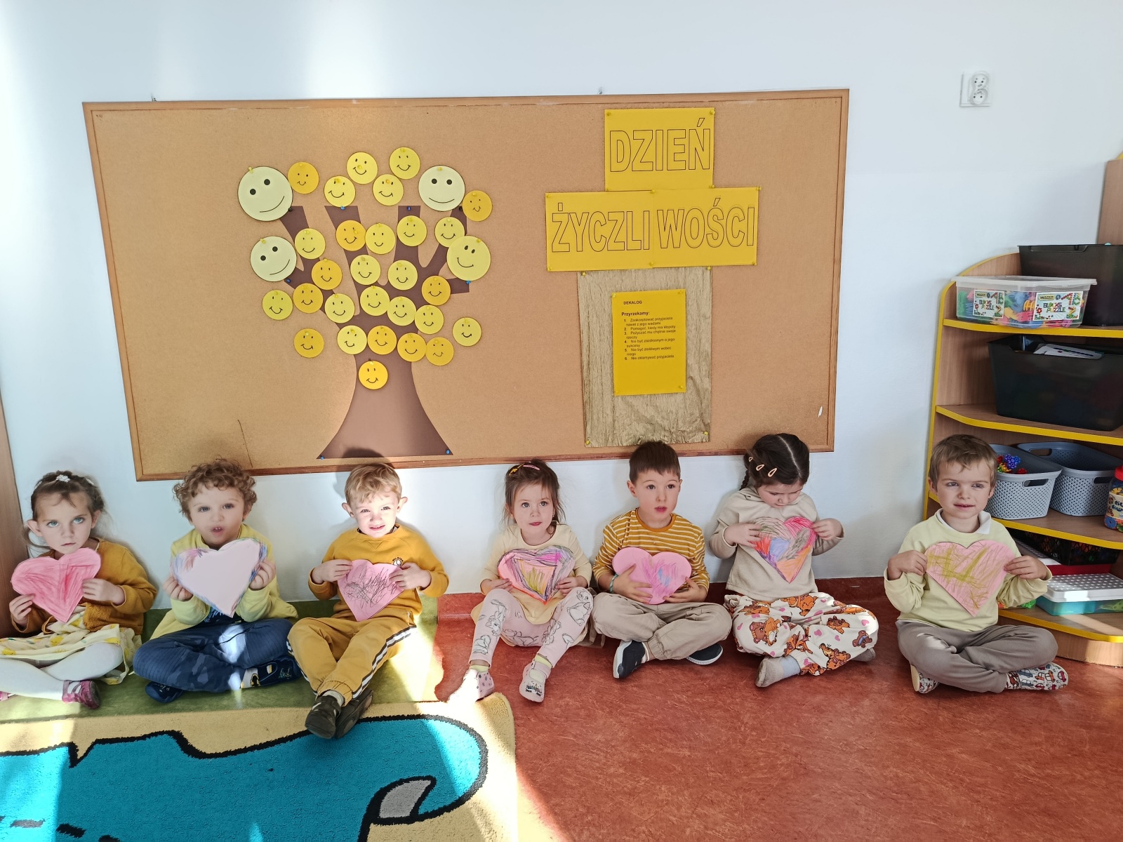 W dniu 28 listopada 2025 r. obchodziliśmy „Dzień Życzliwości”. Był to dzień pełen uśmiechów, dobrych uczynków, miłych słów oraz pozytywnych emocji. Dla podkreślenia wyjątkowości tego dnia, wszyscy byli ubrani na żółto – kolor żółty kolor to radość. Zajęcia zaczęły się od „iskierki życzliwości”, następnie dzieci musiały odszukać list od wróżki życzliwości. Kolejny punktem zajęć była rozmowa na temat życzliwości i co zrobić, aby sprawić komuś radość i spowodować uśmiech na twarzy, przypinając żółte uśmiechnięte buźki na drzewku życzliwości. Przedszkolaki tego dnia pokonywały tor zaufania z kolegą. Przy stolikach wykonaliśmy serduszka dla swojego najlepszego przyjaciela. Uwieńczeniem tak pięknego i radosnego dnia wszystkie przedszkolaki składały przysięgę: „Dekalogu Życzliwości”, gdzie pieczętowały odbicie swojego paluszka na dekalogu. Zdjęcia które znajdują się poniżej, najlepiej odzwierciedlaj ten wspaniały dzień.