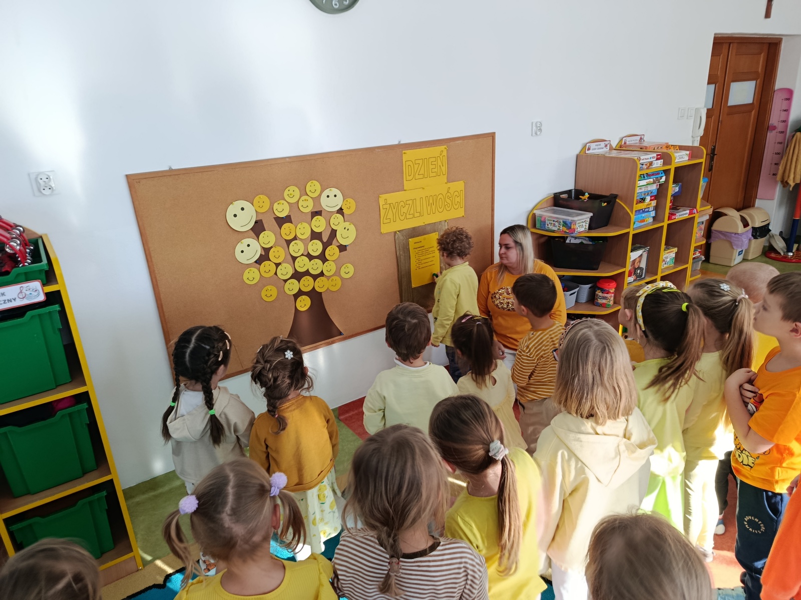 W dniu 28 listopada 2025 r. obchodziliśmy „Dzień Życzliwości”. Był to dzień pełen uśmiechów, dobrych uczynków, miłych słów oraz pozytywnych emocji. Dla podkreślenia wyjątkowości tego dnia, wszyscy byli ubrani na żółto – kolor żółty kolor to radość. Zajęcia zaczęły się od „iskierki życzliwości”, następnie  dzieci musiały odszukać list od wróżki życzliwości. Kolejny punktem zajęć była rozmowa na temat życzliwości i co zrobić, aby sprawić komuś radość i spowodować uśmiech na twarzy, przypinając żółte uśmiechnięte buźki na drzewku życzliwości. Przedszkolaki tego dnia pokonywały tor zaufania z kolegą. Przy stolikach wykonaliśmy serduszka dla swojego najlepszego przyjaciela. Uwieńczeniem tak pięknego i radosnego dnia wszystkie przedszkolaki składały przysięgę: „Dekalogu Życzliwości”, gdzie pieczętowały odbicie swojego paluszka na dekalogu. Zdjęcia które znajdują się poniżej, najlepiej odzwierciedlaj ten wspaniały dzień.