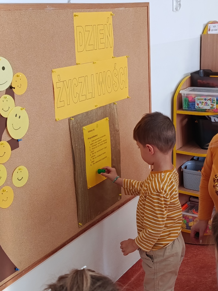 W dniu 28 listopada 2025 r. obchodziliśmy „Dzień Życzliwości”. Był to dzień pełen uśmiechów, dobrych uczynków, miłych słów oraz pozytywnych emocji. Dla podkreślenia wyjątkowości tego dnia, wszyscy byli ubrani na żółto – kolor żółty kolor to radość. Zajęcia zaczęły się od „iskierki życzliwości”, następnie dzieci musiały odszukać list od wróżki życzliwości. Kolejny punktem zajęć była rozmowa na temat życzliwości i co zrobić, aby sprawić komuś radość i spowodować uśmiech na twarzy, przypinając żółte uśmiechnięte buźki na drzewku życzliwości. Przedszkolaki tego dnia pokonywały tor zaufania z kolegą. Przy stolikach wykonaliśmy serduszka dla swojego najlepszego przyjaciela. Uwieńczeniem tak pięknego i radosnego dnia wszystkie przedszkolaki składały przysięgę: „Dekalogu Życzliwości”, gdzie pieczętowały odbicie swojego paluszka na dekalogu. Zdjęcia które znajdują się poniżej, najlepiej odzwierciedlaj ten wspaniały dzień.