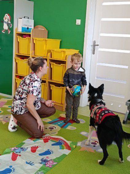Dzisiaj nasze przedszkole po raz kolejny odwiedziła sympatyczna suczka Kira wraz ze swoją opiekunką-panią Karoliną. Nie od dziś wiadomo, że kontakt z psem ma na nas pozytywny wpływ-tak było i dzisiaj. Dzieci podczas prostych zajęć ruchowych z udziałem Kiry uczyły się poprawnego kontaktu z psem, empatii, wrażliwości, a także przełamywały swoje lęki. Zajęcia były pełne pozytywnej energii i roześmianych dziecięcych buziek.