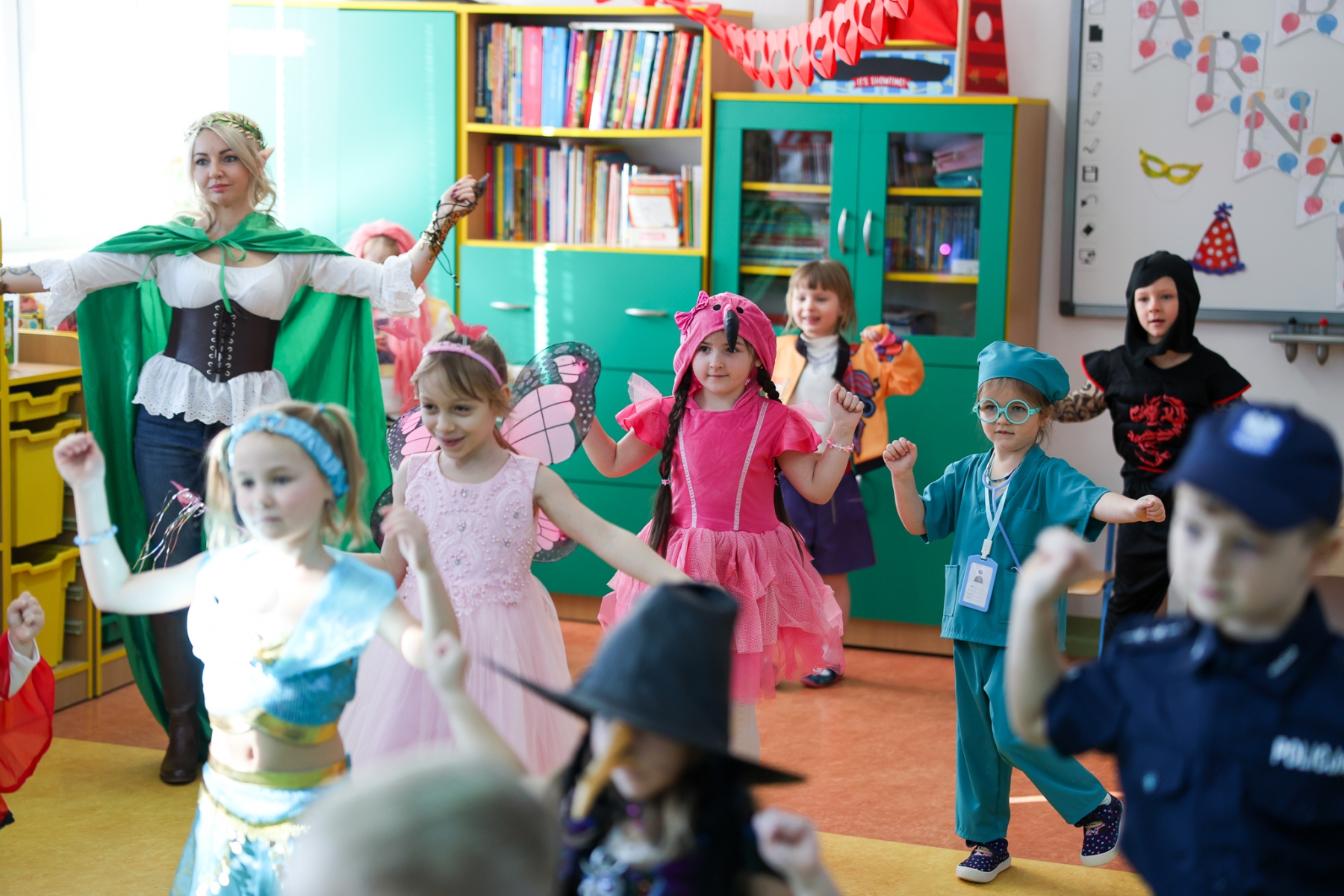 Podczas balu karnawałowego, przedszkolaki z dumą prezentowały bajeczne stroje. Niektóre dzieci z trudem można było rozpoznać! Wystrój sali wprowadził w radosny nastrój oraz zachęcał wszystkich do wesołej zabawy. Przedszkolaki świetnie bawiły się w rytm muzyki porywającej do tańca oraz brały udział w najróżniejszych zabawach organizowanych przez zaproszonego DJ’a.