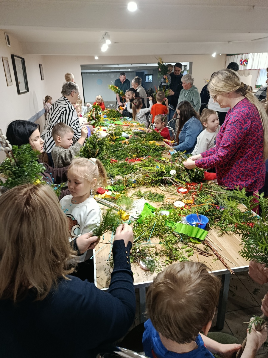 27 marca w naszym przedszkolu zapanowała radosna, przedswiąteczna atmosfera. Wszystko za sprawą wyjątkowych warsztatów tworzenia palm wielkanocnych, w których wzięły udział nasze przedszkolaki wraz ze swoimi bliskimi. Gośćmi specjalnymi były panie z Koła Gospodyń Wiejskich Cisiec Mały, które z ogromną pasją i cierpliwością pełniły rolę ekspertek od tradycji. Pod ich czujnym okiem dzieci uczyły się, jak z gałązek bazi, bukszpanu i kolorowej bibuły wyczarować prawdziwe dzieła sztuki. Spotkanie było doskonałą okazją do poznania przez dzieci zwyczajów wielkanocnych, a także integracji wszystkich zaproszonych. Powstałe palmy były kolorowe i jedyne w swoim rodzaju! Serdecznie dziękujemy paniom z KGW za przekazaną wiedzę, a rodzicom i bliskim za wspólnie spędzony czas.