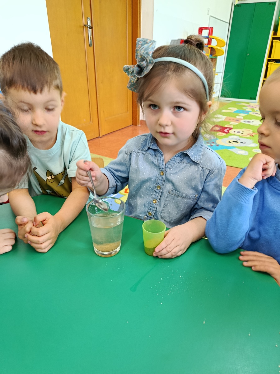 Grupa Motylki wzięła udział w ciekawych zajęciach przyrodniczych z okazji Dnia Wody. Dzieci ubrane na niebiesko, poznały bardzo wiele ciekawych faktów o wodzie – komu i do czego potrzebna jest woda? Jak możemy oszczędzać wodę? Słuchaliśmy różnych odgłosów wody oraz zorganizowaliśmy wyścig z kubkiem – zadaniem dzieci było nie uronić ani kropli wody. Najwięcej radości przyniosły zabawy badawcze – przedszkolaki sprawdzały co pływa a co tonie, co się rozpuszcza a co nie, a także obserwacja różnych stanów skupienia wody. Doświadczenia i eksperymenty rozwijają u dzieci myślenie przyczynowo-skutkowe, ciekawość świata oraz zmysły.